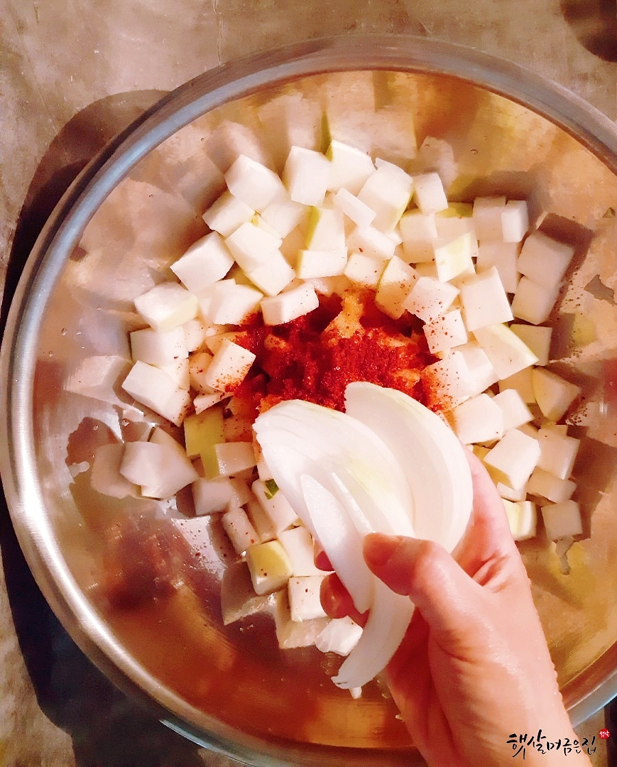 만드는 법: 큰 볼에 고춧가루, 새우젓, 다진 마늘, 다진 생강, 매실청, 찹쌀풀, 멸치 액젓, 갈아둔 양파와 사과(또는 배)를 모두 넣고 고루 섞어줍니다. 양념이 잘 어우러지도록 10분 정도 두어 고춧가루가 불어나게 하는 것이 좋습니다. 이렇게 하면 양념의 색깔도 더 곱고 맛도 깊어진답니다. 갈아 넣는 과일은 단맛과 시원한 맛을 더해주고, 찹쌀풀은 양념이 무에 착 달라붙게 하여 감칠맛을 높여주는 역할을 합니다.